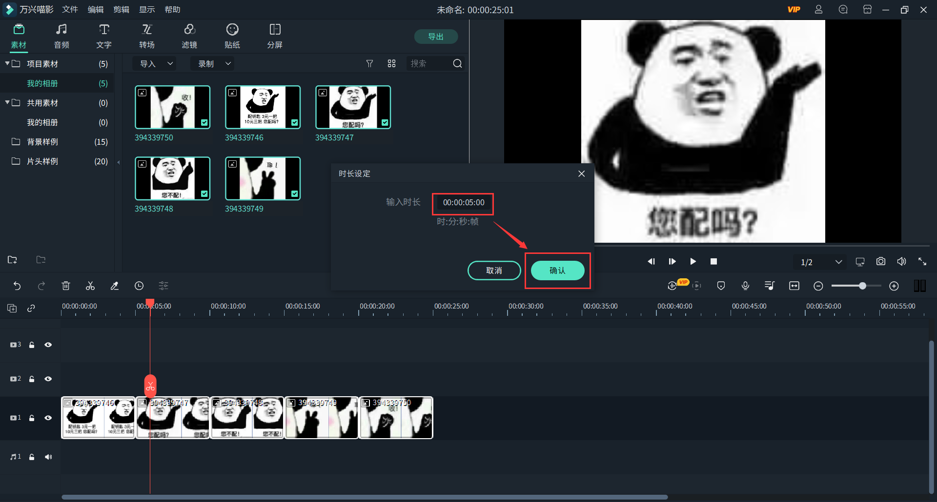 我们在播放时会发现照片播放的时间非常长,所以我们首先要调整照片的播放时间长度。将时间轴上的照片全选起来,然后右键选择时长设定,在弹出界面设置适当的播放时间。