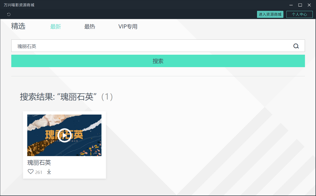点击右上角的资源商城图标,然后在里边搜索闪耀魅力、渐变时尚、瑰丽石英、艺术拼贴 ,我们可以找到相关的资源,然后点击下载即可。