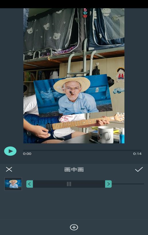 然后,选择下方工具栏中的画中画功能,从本地中导入照片或视频,就会发现选中素材覆盖在原视频上,调整素材的位置和大小,和时间轴上的时间。