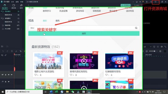 第一步:准备需要的资源包,打开“资源商城”,搜索“科幻素材”、“炫酷片头”等关键字,下载即可自动安装。