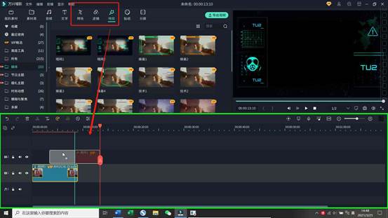 第三步:按第二步的做法,分别打开“特效”、“转场”等,按需选择添加的科幻元素素材,即可构成一个富有科幻感的画面。