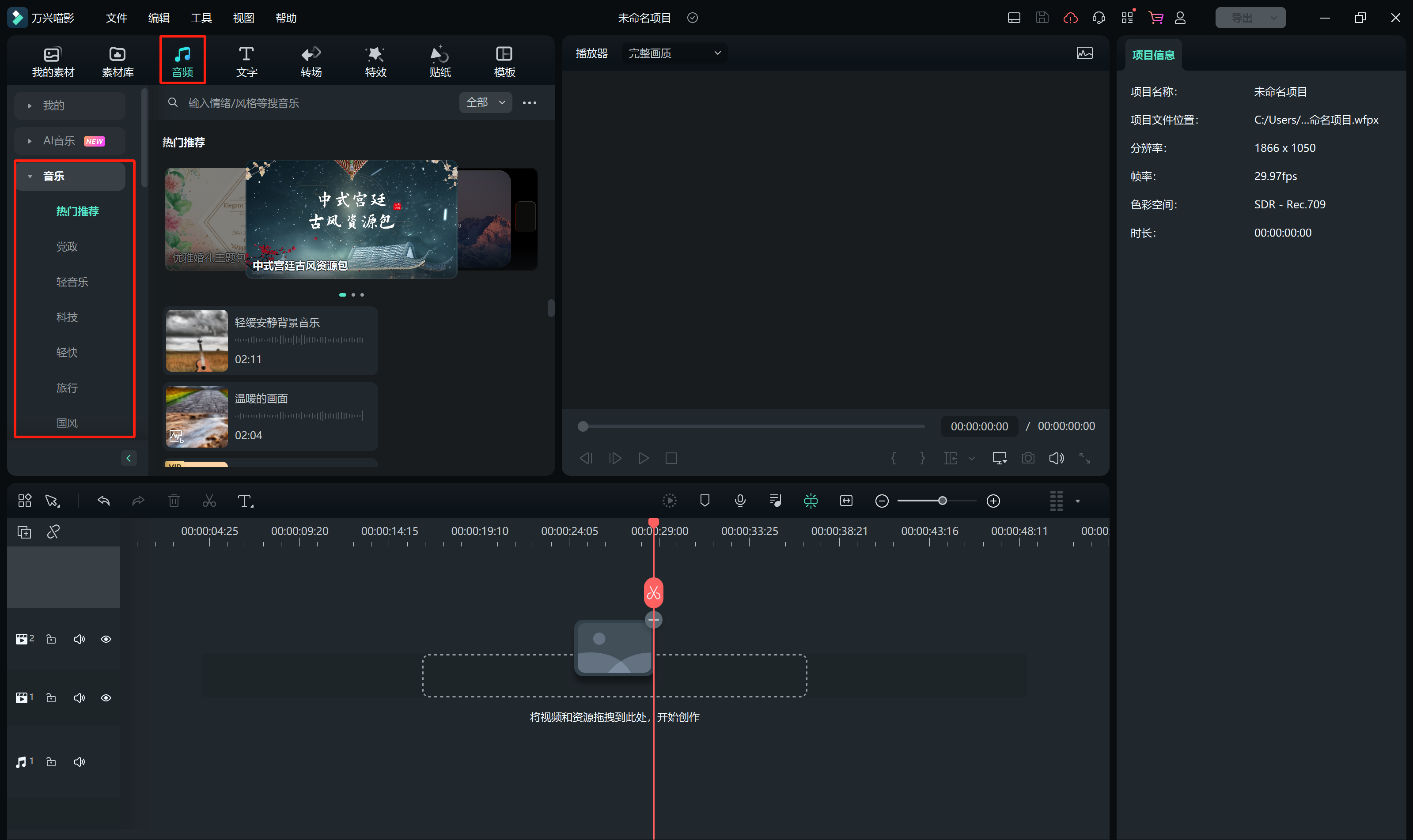 漫威混剪视频制作的主要内容是添加新的元素,可以根据视频内容,在软件中选择适合的音乐素材作为背景。点击软件上的“音频”按钮,可以直接在搜索框中搜索指定的音乐,也可以根据左侧列表的推荐,选择适合的动漫主题歌曲,将音乐素材拖拽到下方的音频轨道上。