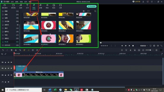 第四步:点击“转场”模块,给画面设置个简单的转场,使视频进出版面动画元素充足。