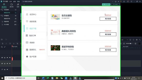 第三步:在新弹窗中点击下载我们的生日资源包,一个生日资源包已包含转场、特效、媒体等主题文件,等到下载完成,资源即自动安装并附加到原有的各大板块中,无需用户自行操作。