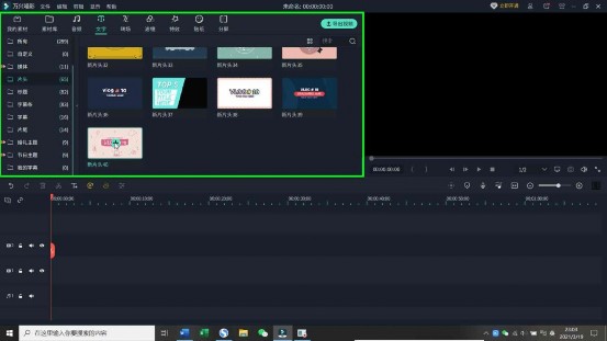 第四步,回到主界面,首先点击“文字”板块,选择一个片头模板并添加到编辑轨道上面。