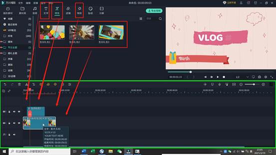 第五步,一并把刚刚准备的资源包素材添加到片头界面上(注:新下载的资源文件都是带红点,按需从中选择即可)。具体包括“文字”版块的“节日主题”、“特效”版块的“节日主题”、“转场”版块的“节日主题”部分,分别添加到编辑轨道上。
