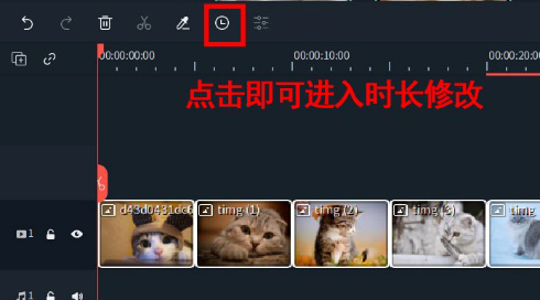 “Ctrl+A”全选轨道上照片,在功能栏中找到时钟样式的“时长”功能键,点击后可在弹出菜单中看到每一张照片所设定的时长为五秒,根据需要修改素材时长,例如设定时长为三秒,点击“确认”后可看到所有照片时长都变为三秒。