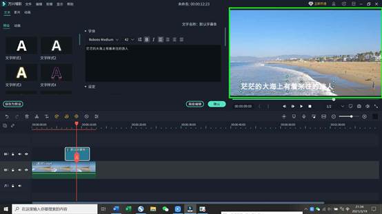 5、在编辑框内修改模板文字为需要添加的字幕内容,除此以外选择字体样式、颜色,注意不要与背景颜色相同,最后拖动字幕位置以及持续时间长度,即可完成对字幕编辑啦。