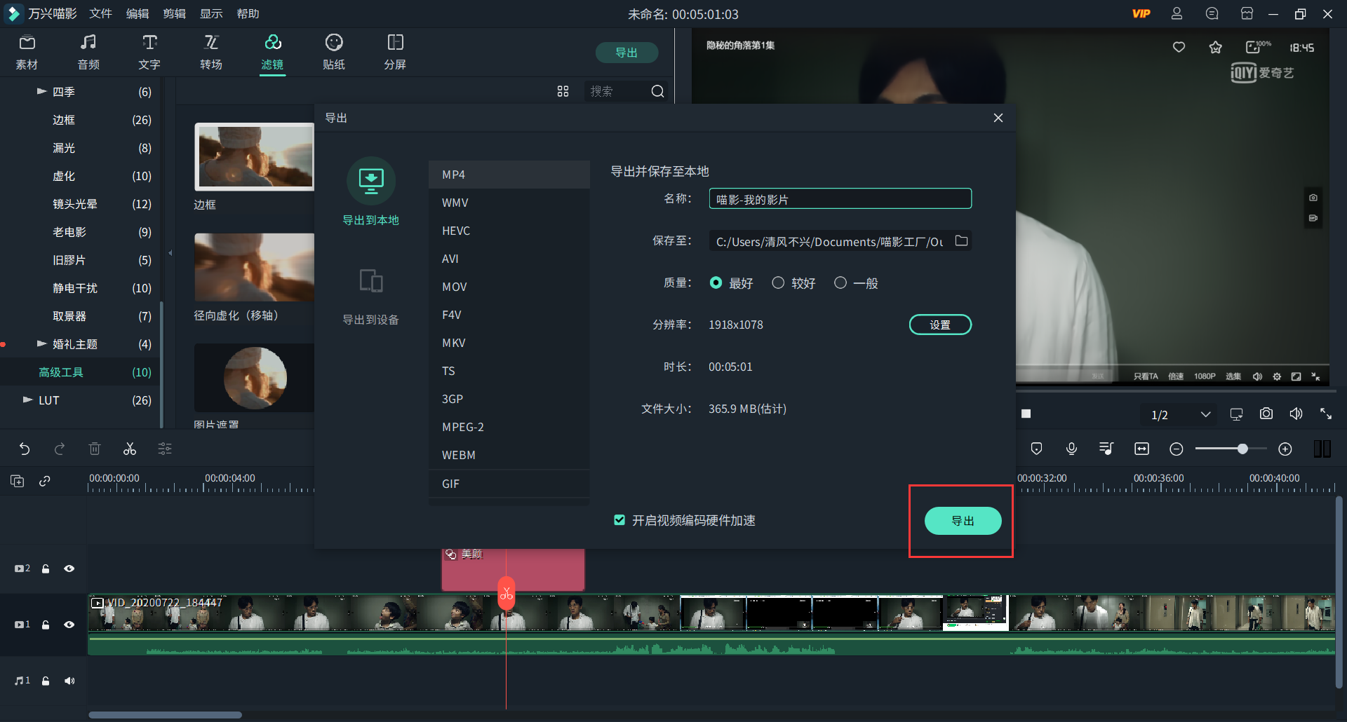 第四步,导出视频,参数设置完成后点击导出,这样一个简单的视频后期美颜就制作完成了,是不是很简单呢。