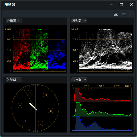 对于更精准的颜色调节,可以查看下面的颜色示波器,有更专业的色彩展现。