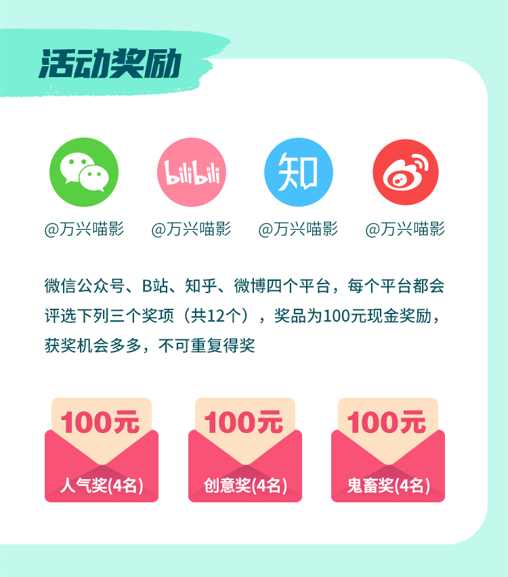 微信公众号、B站、知乎微博、四个平台,每个平台都会评选人气奖、创意奖、鬼畜奖,共有12个获奖机会,奖品为100元现金奖励,获奖机会多多,不可重复得奖