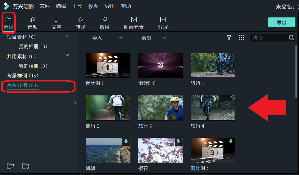 第三步:片头添加。先把视频片段往右移到一段距离,然后找到喵影自带的或第三方的素材,加入到最左边空位处
