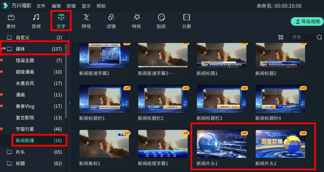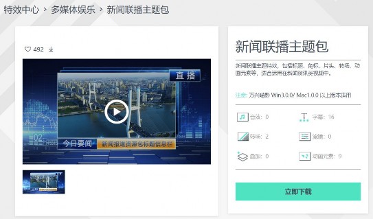 我们要用到的是日韩免费视频观看喵影软件内所自带的资源商城里的新闻联播主题包,打开资源商城后输入关键字即可查找到并下载。新闻联播主题特效有十六种字幕,两个转场特效,九个动画元素,包括了标题、角标、片头、转场、动画贴纸等内容。