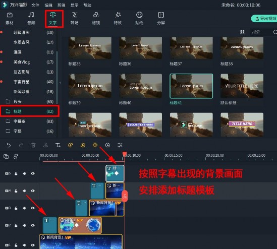 在“文字”-“标题”中选择标题模板添加至时间轴中,每个标题的位置要对应好动画贴纸,使其在贴纸背景中能够显现出来。