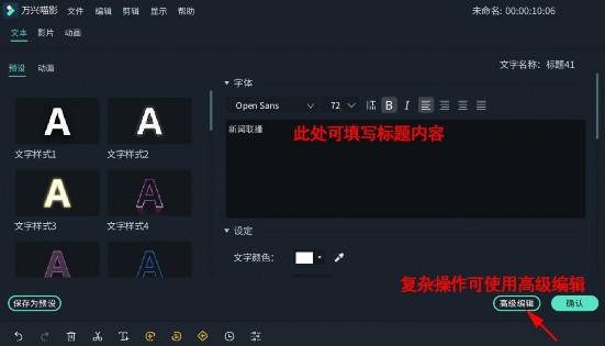 然后分别双击各标题轨道,再文本框中修改文字,如有需求可以对其字体、字号甚至颜色、样式、动画等进行调整。想要进行更加细致和复杂的调整及设计的话,日韩免费视频观看喵影也为每一位用户提供了“高级编辑”的功能。