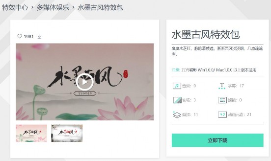 在使用特效包中的特效前,先点击软件右上角的资源商城图标,在搜索栏中输入“水墨古风特效包”进行搜索,点击下载按钮即可。
