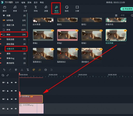 将其导入到素材库中,并拖拽添加至时间轴中,并为其添加一个水墨叠覆特效。