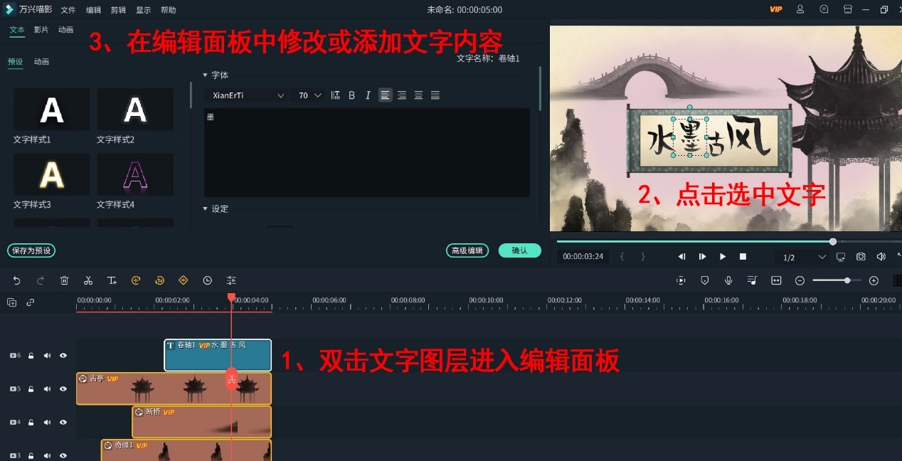 在图片(短视频)轨道上方的一条轨道上添加符合同一主题的动画贴纸。小编选用的是古亭、奇峰和断桥三种贴纸,将其按照出现的顺序依次放置于时间轴轨道上,并调整好其位置和大小。我们通过点击拖拽视频画面中的动画贴纸即可实现它们的移动,大家可以随心所欲安排它们在画面中的出现,同时,我们在点击了贴纸后,会出现一个选框,这个选框可以帮助我们调整其大小,甚至可以调整角度。
