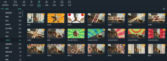 除了节日主题,还可以根据视频的风格来选择合适的转场,有水墨、武侠的古风系列,还有80年代、老式电影、蒸汽朋克、日式旅行、ins风等流行的风格。
