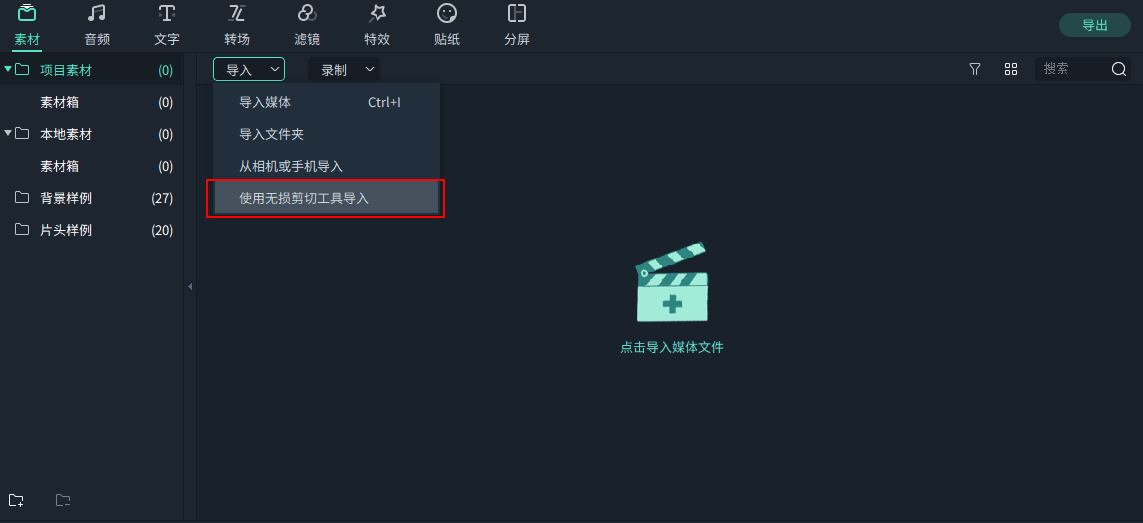 1. 打开日韩免费视频观看喵影,点击“导入”,选择“使用无损剪切工具导入”。