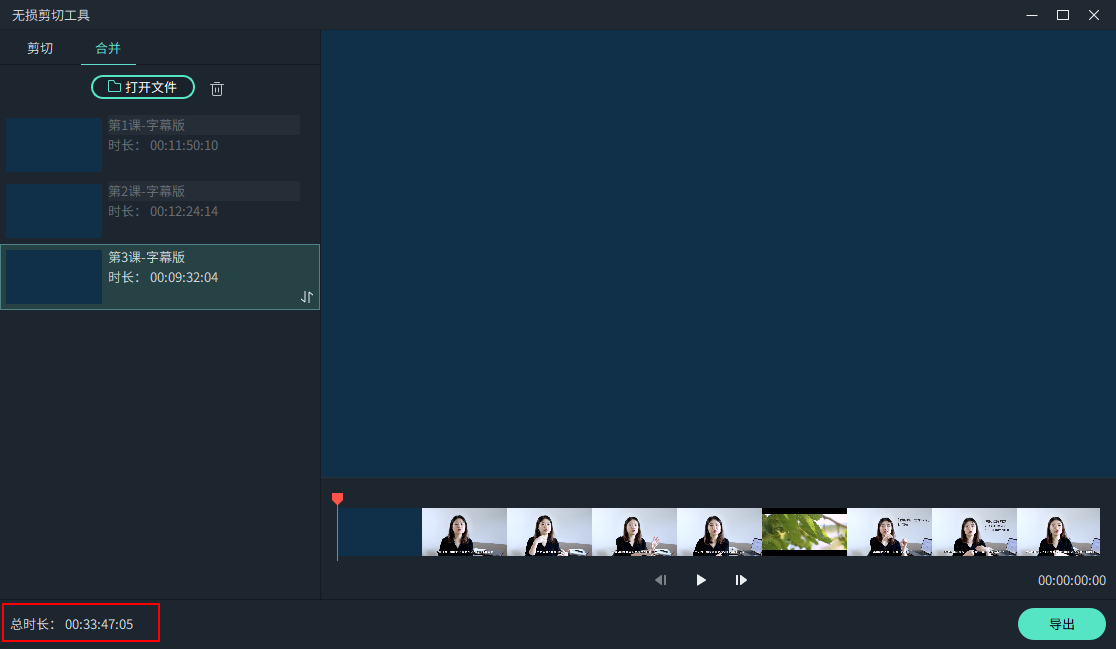 2. 在合并编辑面板的左下角可以看到所有视频片段合并的之后的总时长。