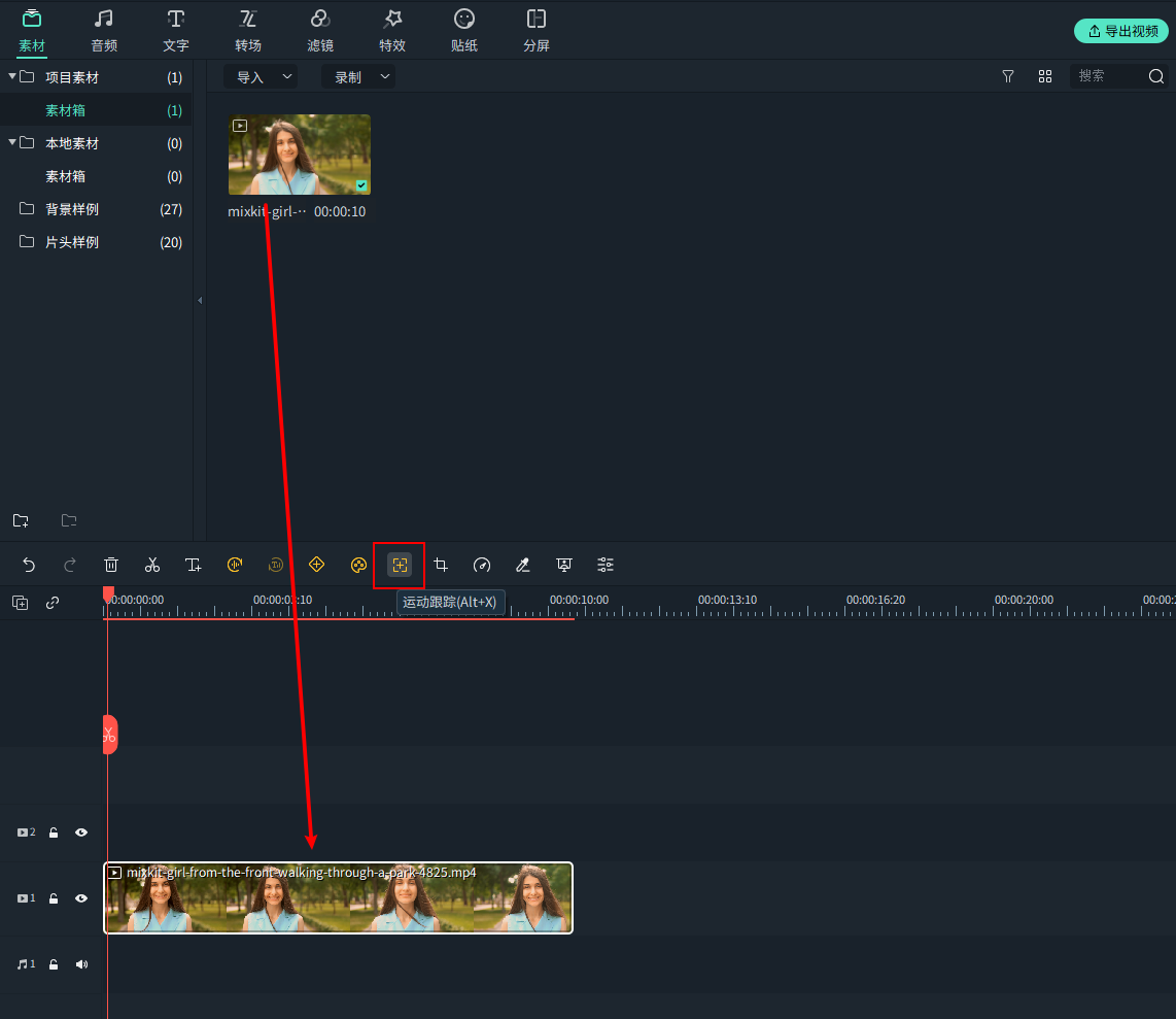 将准备好的视频导入到时间轨道上,选中需要的视频片段,在上方工具栏找到【运动跟踪】图标按钮,进入运动跟踪编辑页面。