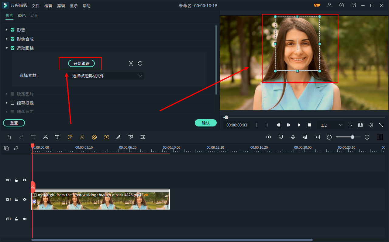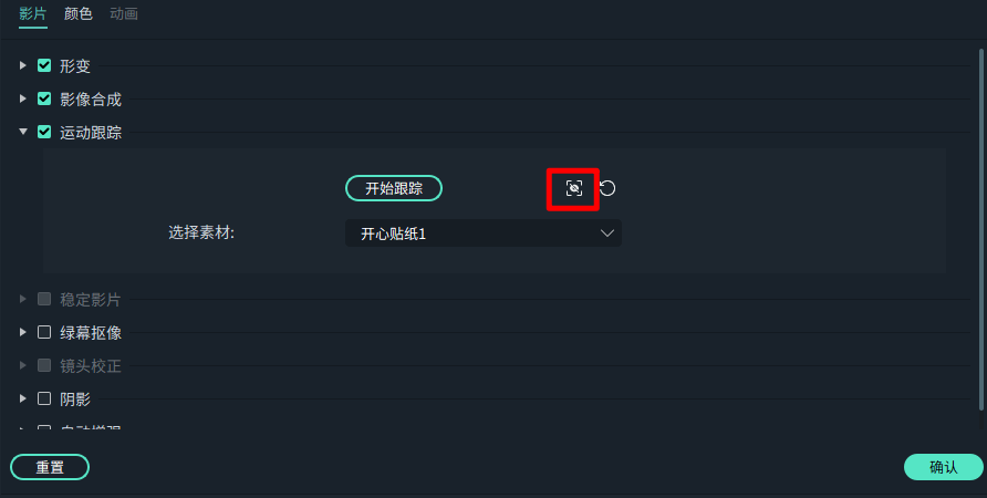 打开运动跟踪功能后,会发现预览窗口上多了一个目标跟踪框,我们可以任意的调整跟踪区域,然后点击属性面板上的开始跟踪。
