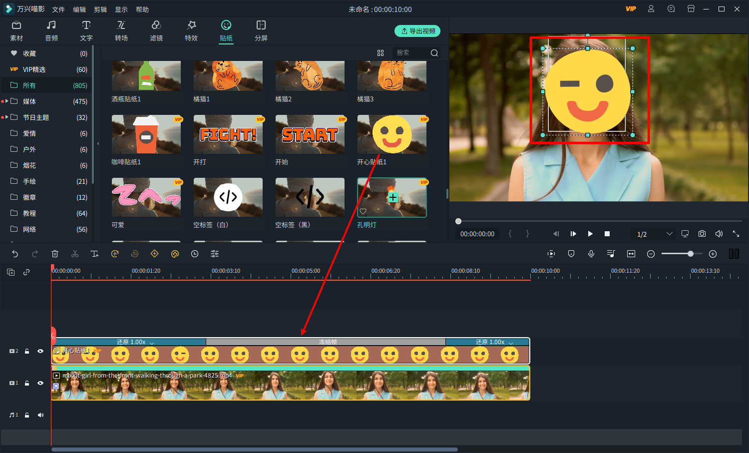 渲染完成后,我们可以利用喵影为我们提供的丰富的特效资源素材,拖拽到轨道上,然后调整素材的大小和位置。