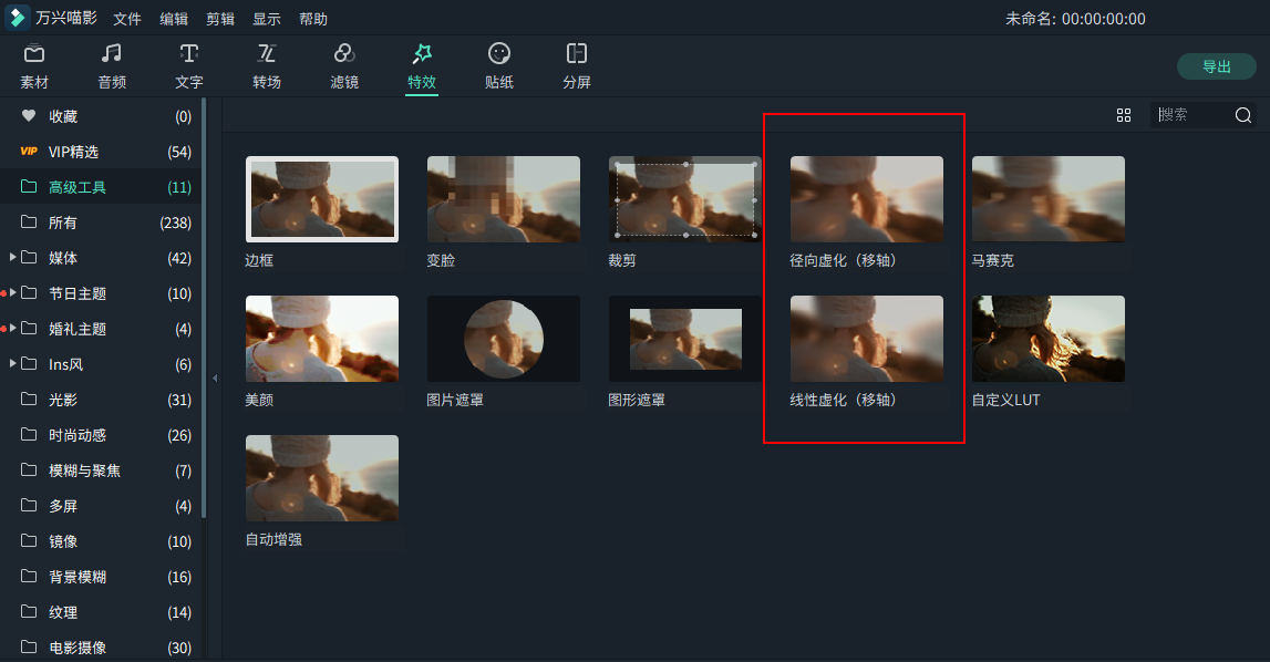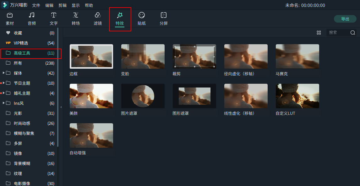 高级编辑工具包括移轴特效, 马赛克以及变脸特效等。要使用高级编辑工具,首先需要点击界面顶端的 “效果” 按钮。 然后在左侧边栏的“滤镜”分类下找到“高级工具”并点击打开选项菜单。
