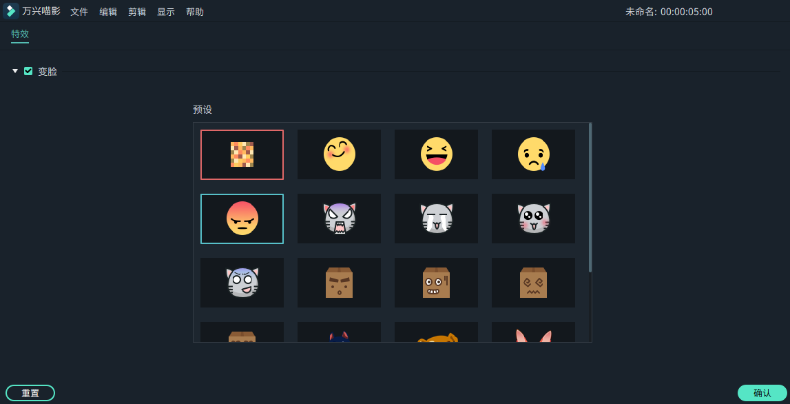 2. 双击时间轴上的特效打开“变脸”特效媒体库。选择需要的变脸效果。