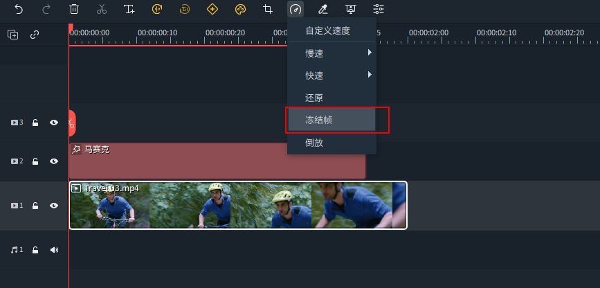 1. 您还可以在视频播放到达目标帧后,点击时间轴上方菜单栏中的速度控制图标,在弹出的菜单栏中选择“冻结帧”选项来制作冻结帧效果。
