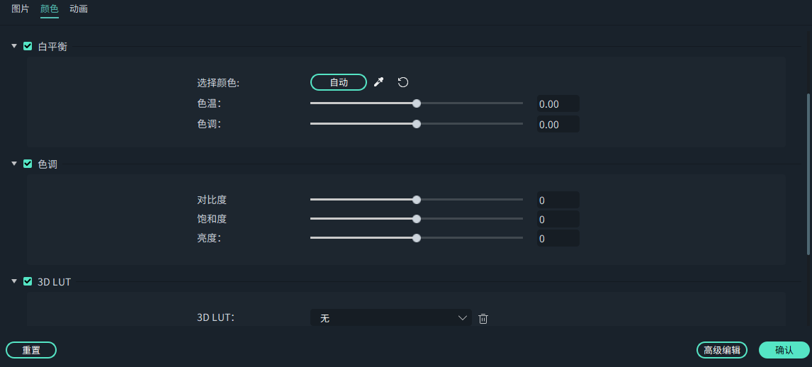 双击图片,然后切换到“颜色”选项卡。在“颜色”设置界面,你可以调整色温,色调,对比度,饱和度和亮度。你还可以应用3D LUT效果。要进行更高级的颜色校正,请单击“高级编辑”按钮。调节结束后,点击“确认”按钮保存更改。