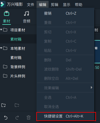 点击【编辑】-【快捷键设置】或者通过快捷键【Ctr+Alt+K】进入自定义快键键面板。