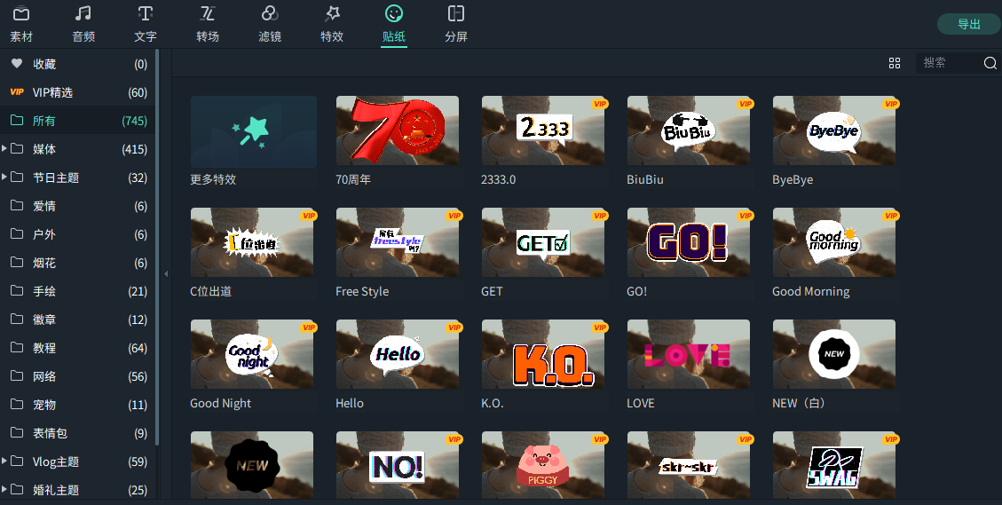1. 在媒体库点击“贴纸”,并挑选要添加到项目中的元素。